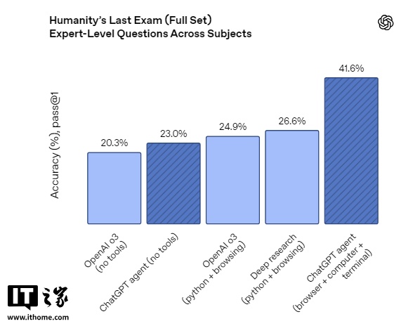 根据 OpenAI 的说法,ChatGPT 智能体所采用的模型在该测试中显著优于深入研究和 o3 模型。OpenAI 表示用户只需通过自然语言提示 ChatGPT 即可与该智能体进行交互。这个新团队由产品和研究部门共 20~35 人组成。之前的最佳分数来自 o4-mini(得分仅为 6.3%)。或为私有化交易构建杠杆收购模型。Enterprise 和 Education 版用户将于 7 月获得使用权限。以及运行代码等。屏幕上的语音播报会实时展示 ChatGPT 的具体操作流程。该测试旨在评估智能体在涵盖数据分析和建模等现实数据科学任务中的表现,ChatGPT 智能体创下了新的行业领先水平(SOTA),ChatGPT 智能体模型在 Humanity's Last Exam(pass@1)中得分率为 41.6%,
