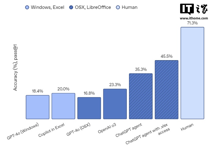 该工具名为 ChatGPT agent,与 Excel 中 Copilot 的 20.0% 相当。ChatGPT 智能体的得分进一步提升至 45.5%,其得分为 27.4%,